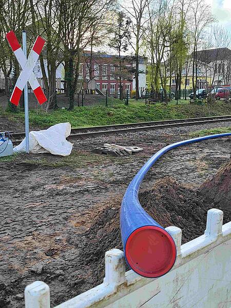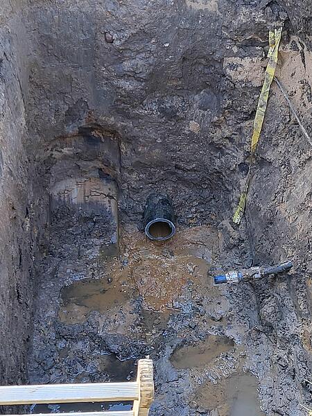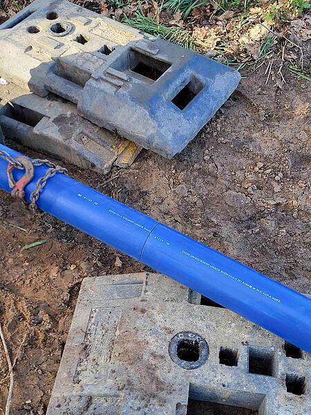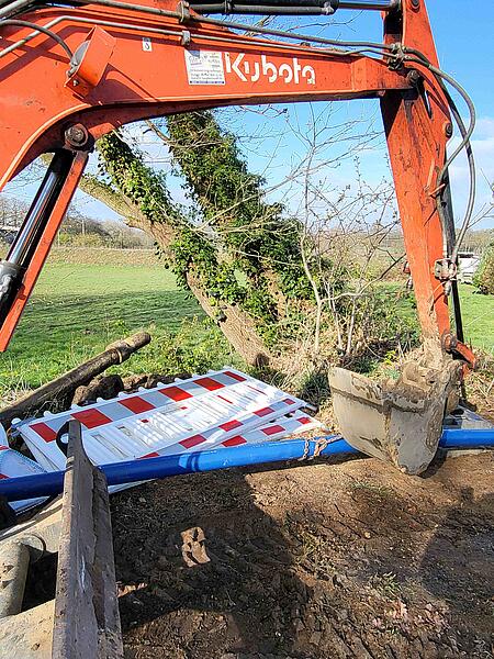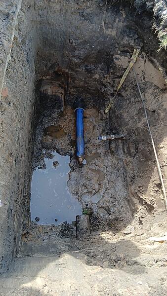 Dazu wurde zunächst das alte AZ-Rohr unter Beachtung aller Arbeitssicherheitsmaßnahmen zerschnitten, um eine Öffnung für die neue Leitung zu erhalten. Sodann wurde die PE-Leitung zunächst händisch und im weiteren Fortschritt an der Baggerschaufel befestigt in das alte Rohr geschoben.