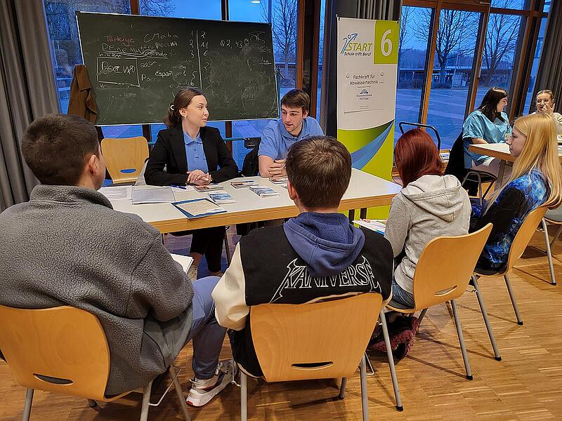 Bad Essen/Rödinghausen. Nicht lange schnacken: Bei „Start – Schule trifft Beruf“ ging es um den direkten Austausch zwischen „alten Hasen“ und künftigen Azubis. Bei der Veranstaltung in der Gesamtschule Rödinghausen stellten unsere ehemaligen Auszubildenden Margarita Keller und Lennart Fietz den Wasserverband Wittlage als Ausbildungsbetrieb vor.