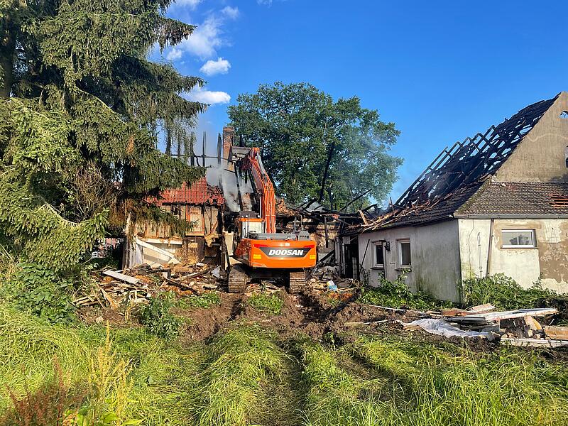 Erschwerend kam bei dem Einsatz hinzu, dass auf dem Heuboden des Gebäudes Stroh gelagert war, dieser aber natürlich beim Brand nicht betreten werden konnte. Wir halfen kurzerhand mit unserem Doosan-Kettenbagger aus und Christian Wefel von der UHV-Kolonne beförderte damit das Stroh auf ein angrenzendes Feld, wo es gelöscht wurde. Schließlich musste der Bagger aber auch die durch das Feuer einsturzgefährdeten bzw. abgesackten Giebel des Hauses abreißen.