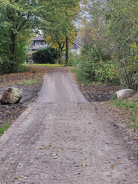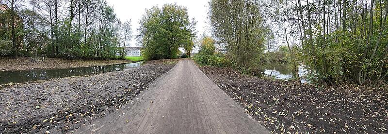 Entstanden ist eine gut definierte Mulde. Bei Regenwetter kann es nach wie vor passieren, dass der Weg an dieser Stelle vorübergehend nicht passierbar ist. Allerdings wird es dank des Rückbaus einer der beiden Überlaufschwellen keine „Insellage“ mehr geben. Vielmehr wird es jetzt möglich sein, trockenen Fußes zum Ausgangspunkt zu gelangen. Vor allem aber wird durch die genannten Maßnahmen das Speichervolumen des Ententeichs von 19.200 Kubikmetern auf ca. 24.600 Kubikmeter, also um fast 30 Prozent erhöht wird.