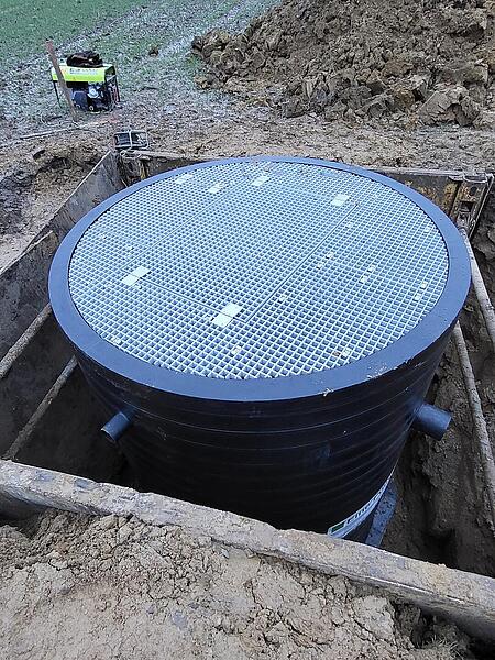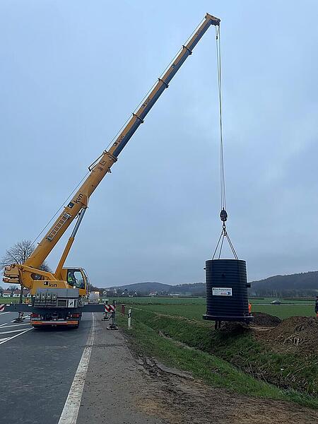 Für das Einlassen des sieben Tonnen schweren Pumpwerks in den dafür hergestellten Schacht war schweres Gerät erforderlich, ein Kran kam zum Einsatz, die Bundesstraße musste für etwa drei Stunden halbseitig gesperrt werden.