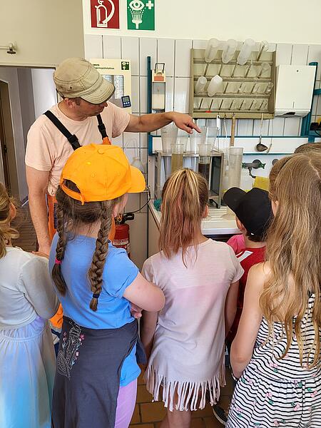 Auf der Kläranlage konnte unser Kollege Ralf Schmieding diese sehr anschaulich beantworten. Überhaupt war das Interesse der Kinder im Alter von fünf bis zehn Jahren an den Vorgängen in der großen Anlage geweckt. Rechen, Sand- und Fettfang, Vorklärbecken, Belebungsbecken, Nachklärbecken und Labor – die Kinder lernten alle Stationen der Kläranlage kennen. Auch machte Ralf Schmieding sie noch darauf aufmerksam, dass man keine Lebensmittel (vor allem wegen der Nager) und – ganz wichtig – keine Feuchties in die Toilette werfen darf. Die reißfesten Tücher verheddern sich nämlich in Pumpen und können ganze Anlagen zum Stillstand bringen.