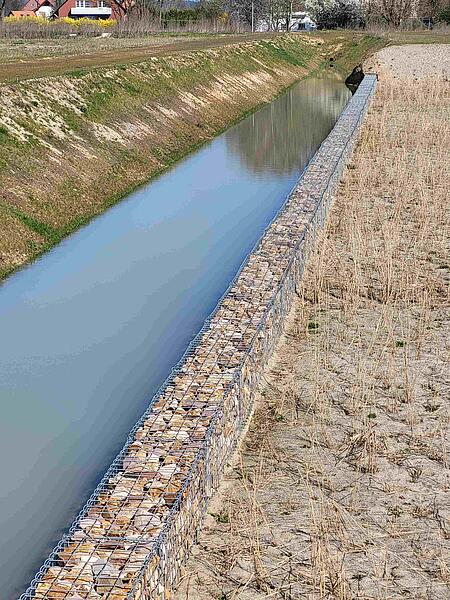 Das Wasser aus dem Regenwasserkanal wird in ein offenes langgestrecktes Vorbecken als Verteilerbauwerk geleitet, welches an einer Seite mit einer Gabionenwand versehen ist. Durch diese Wand strömt das Wasser mit gleichmäßig verteilt in ein zweites Becken.
